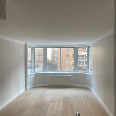 With large bay windows offering abundant natural light and an open layout connecting the kitchen to the living space, this apartment feels expansive and welcoming. The warm-toned flooring complements the neutral walls, providing the perfect canvas for any interior décor style.